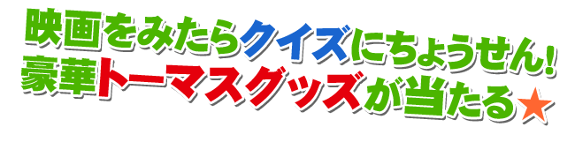『映画 きかんしゃトーマス サンタをさがせ! パーシーのクリスマス急行』を観てくれたお友達には、かんたんなクイズだよ。 クイズに正解すると、抽選で豪華トーマスグッズをプレゼント♪